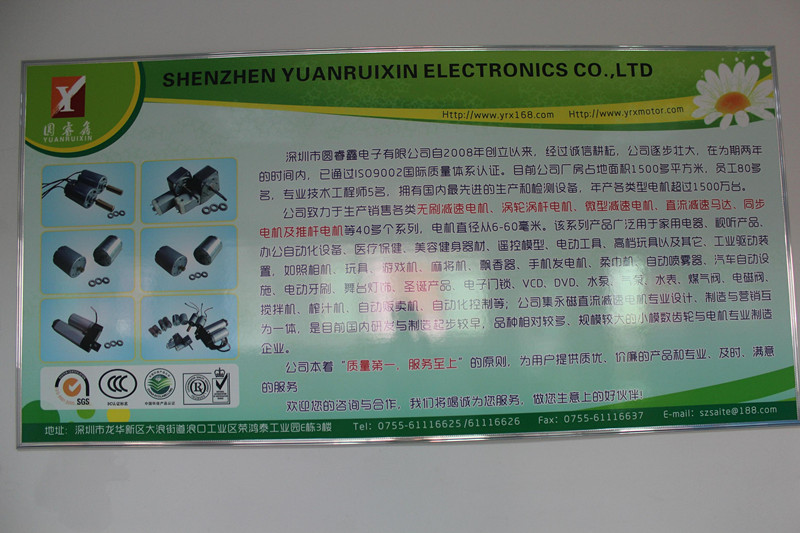 深圳市圓睿鑫電子有限公司自2008年創(chuàng)立以來(lái),經(jīng)過(guò)誠(chéng)信耕耘,在為期兩年的時(shí)間內(nèi),已通過(guò)ISO9001:2000國(guó)際質(zhì)量體系認(rèn)證。公司廠房占地面積2000多平方米,員工100人,專業(yè)技術(shù)工程師6名,擁有國(guó)內(nèi)最先進(jìn)的生產(chǎn)和檢測(cè)設(shè)備,年產(chǎn)各類減速電機(jī)超過(guò)2~300萬(wàn)臺(tái)。因公司發(fā)展需要,于2020年底,將生產(chǎn)基地遷往擁有最美小鎮(zhèn)之稱的東莞市清溪鎮(zhèn),依山傍水,依托美麗的大自然環(huán)境和地方文化,全新的東莞市圓睿鑫電子有限公司將借助深圳母公司平臺(tái),一步步走上新的臺(tái)階。
